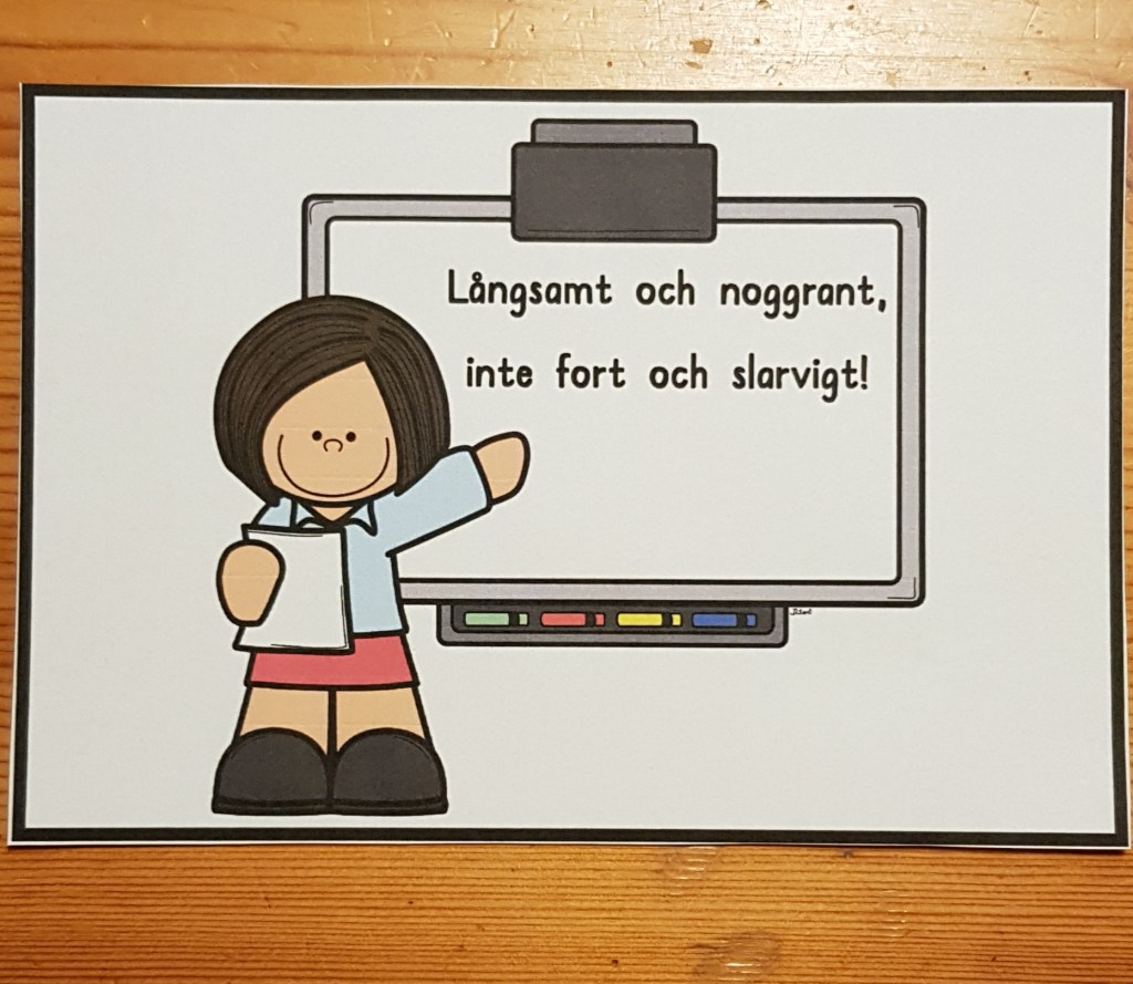 Det är lätt hänt att det blir tävling och att en bara vill bli klar med sina uppgifter. Då blir det lätt slarvigt så vi försöker att påminna om att vi ska arbeta långsamt och noggrant inte fort och slarvigt. Nu ska det även komma upp en påminnelse på väggen i klassrummet.