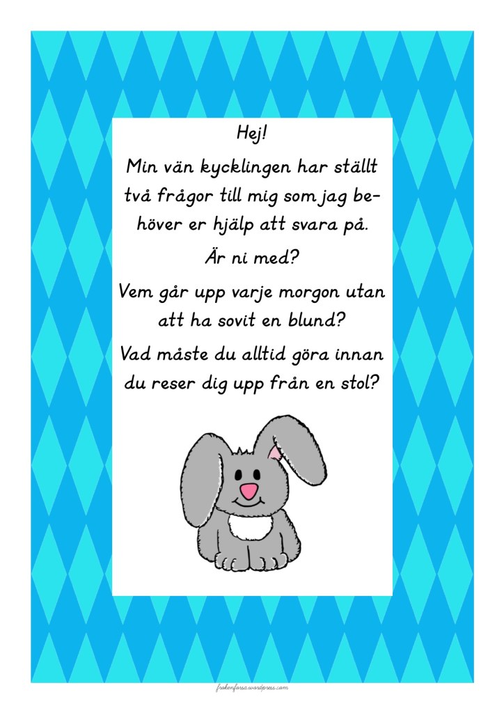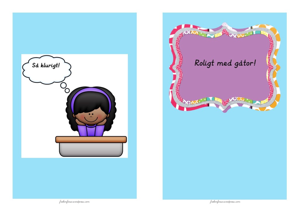 Har samlat 70 kluriga och roliga gåtor i ett litet häfte. Skriv ut dubbelsidigt och vänd längs kortsidan så blir det som en liten bok med fram och baksida.