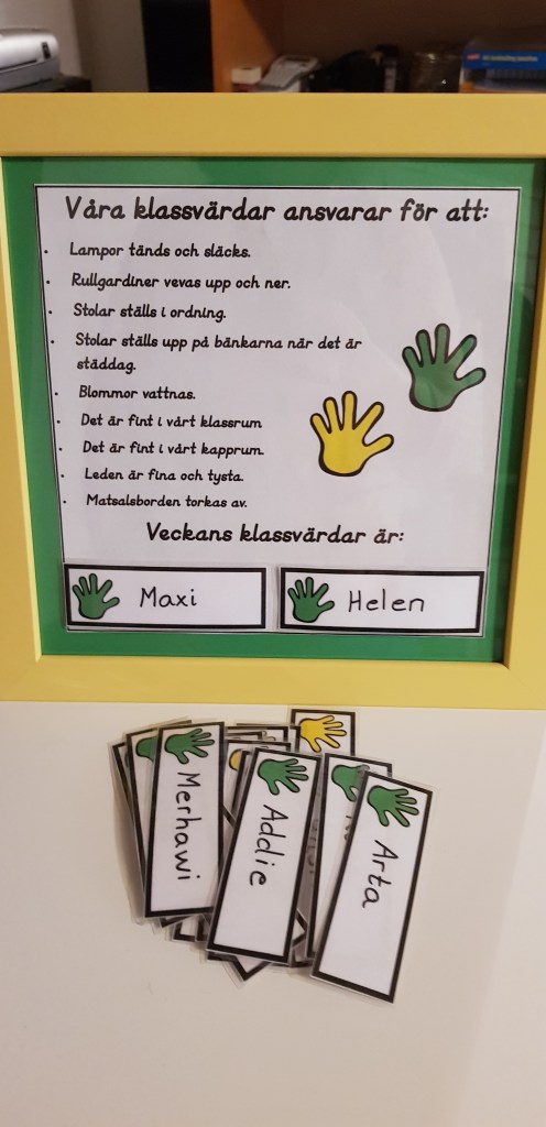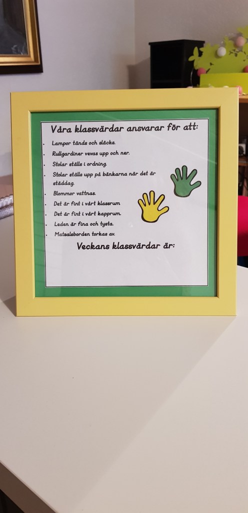 I slutet av förra terminen började vi lite smått med att ha klassvärdar vilket var mycket uppskattat. Nu när mina elever blir tvåor tänker jag att vi ska ha veckans klassvärdar som ansvarar för några av våra sysslor. Hittade fina ramar på IKEA (21cmx21cm) och gjorde en mall som passar mig och min klass. Lägger upp den här om det är någon mer som vill använda.