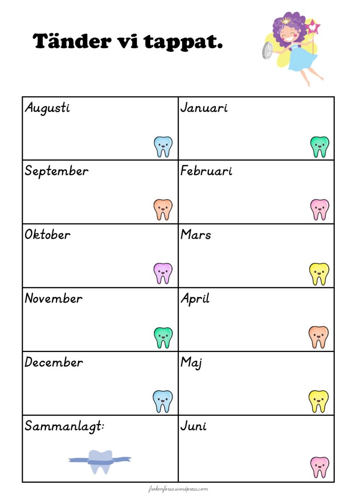 Här kommer ett material för att dokumentera hur många tänder eleverna i klassen tappar under ett läsår. Roligt att använda som träning i matematik när man jämför antalet tappade tänder mellan olika månader och kanske gör diagram av antalet tappade tänder.