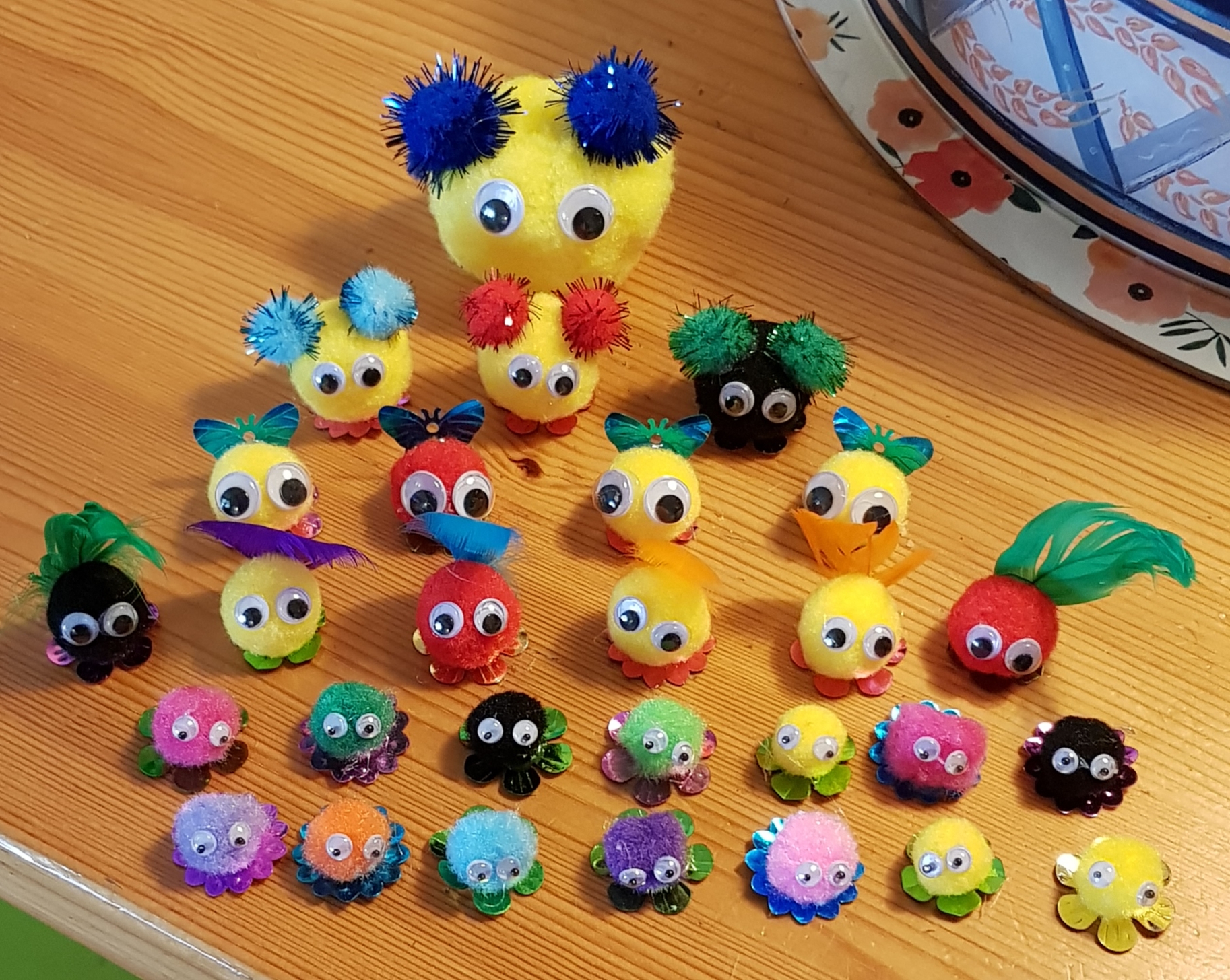 Idag öser regnet ner och då kliar det i mina skaparfingrar. Hittade ett gäng pompom bollar och plastögon i hobbyrummet och då var det inte svårt att veta vad jag skulle göra.