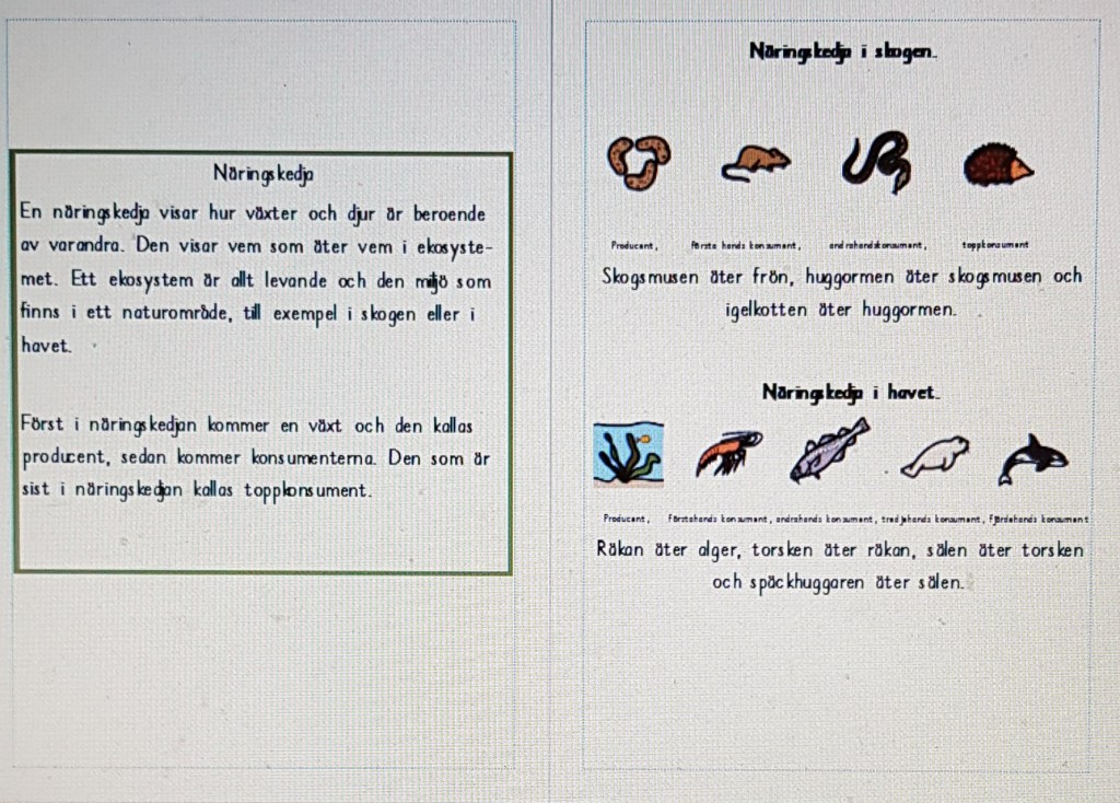 När vi arbetade med näringskedjor läsåret som var gjorde jag dessa material som vi använde oss av.