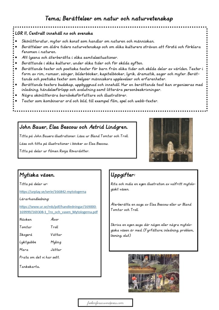 Sportlovet är slut och vi börjar ett nytt tema. Nu ska vi läsa böcker av Elsa Bescow, titta på illustrationer av John Bauer och lära oss om olika mytologiska väsen. Vi ska återberätta, skriva, rita och måla.
