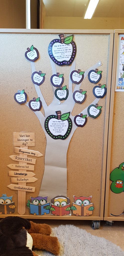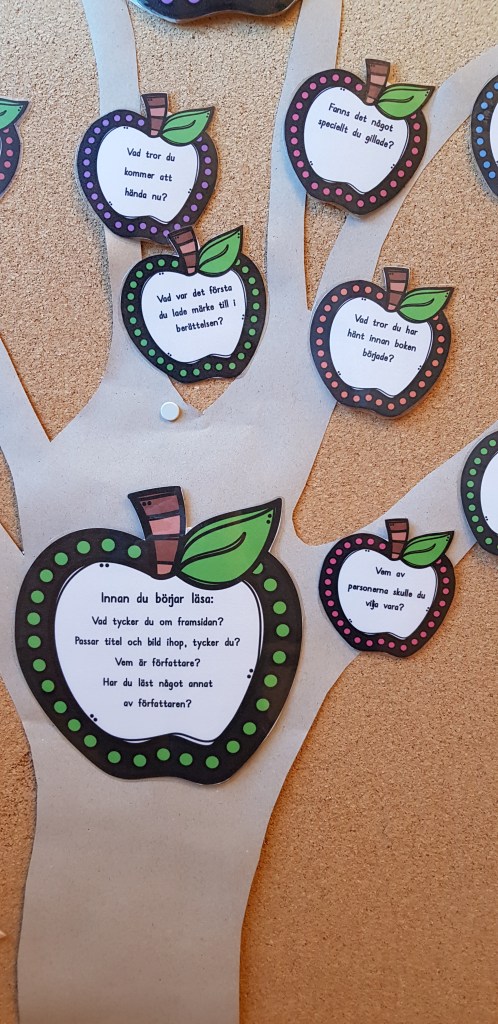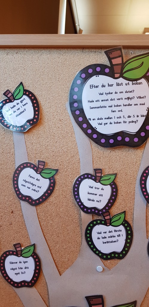 Vår läshörna har fått ett äppelträd med frågor som man kan besvara före, under och efter läsningen. Frågorna är hämtade från Aidan Chambers och de fina skyltarna nere till vänster kommer från Nelly Bonner (https://lararenellybonner.se/).