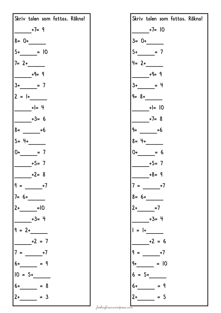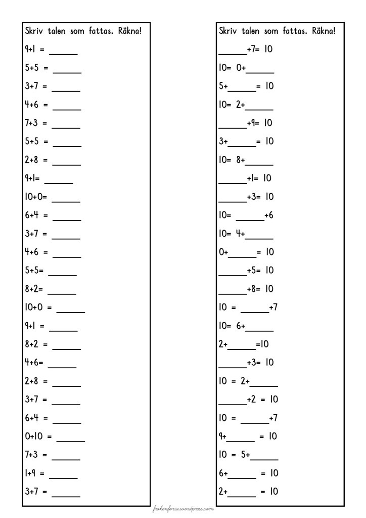 Här kommer ett test till lilla plus. Samma tanke som testerna för fem-kompisarna och tio-kompisarna. Sätt en bestämd tid och se hur långt eleverna kommer. Upprepa och se hur långt de kommer efter att ha tränat ett tag.